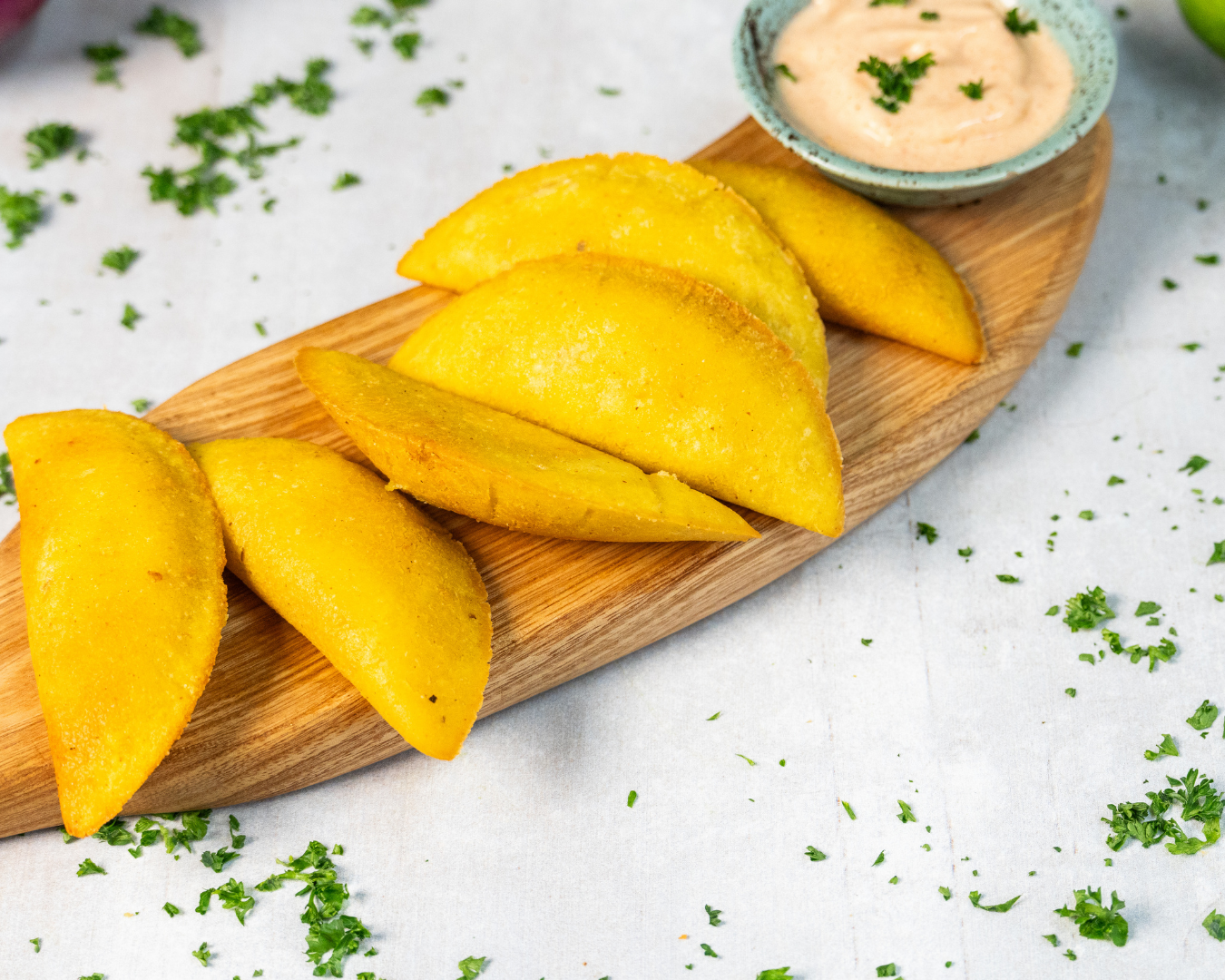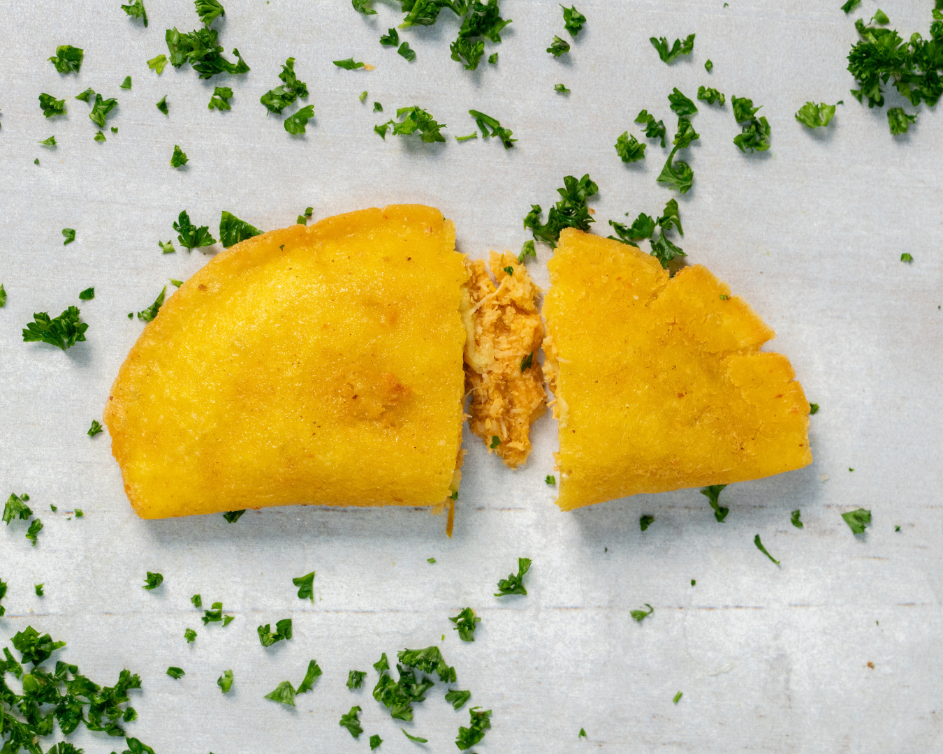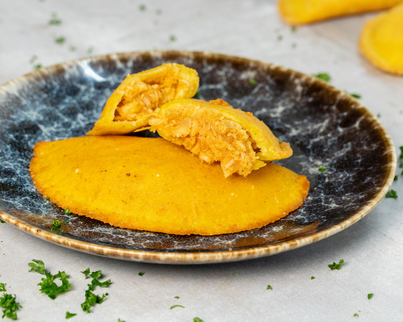 Pequeña y deliciosa, esta empanada está hecha con masa de maíz dorada y ligeramente crujiente, rellena con un guiso de pollo tierno y especiado que resalta los sabores tradicionales.