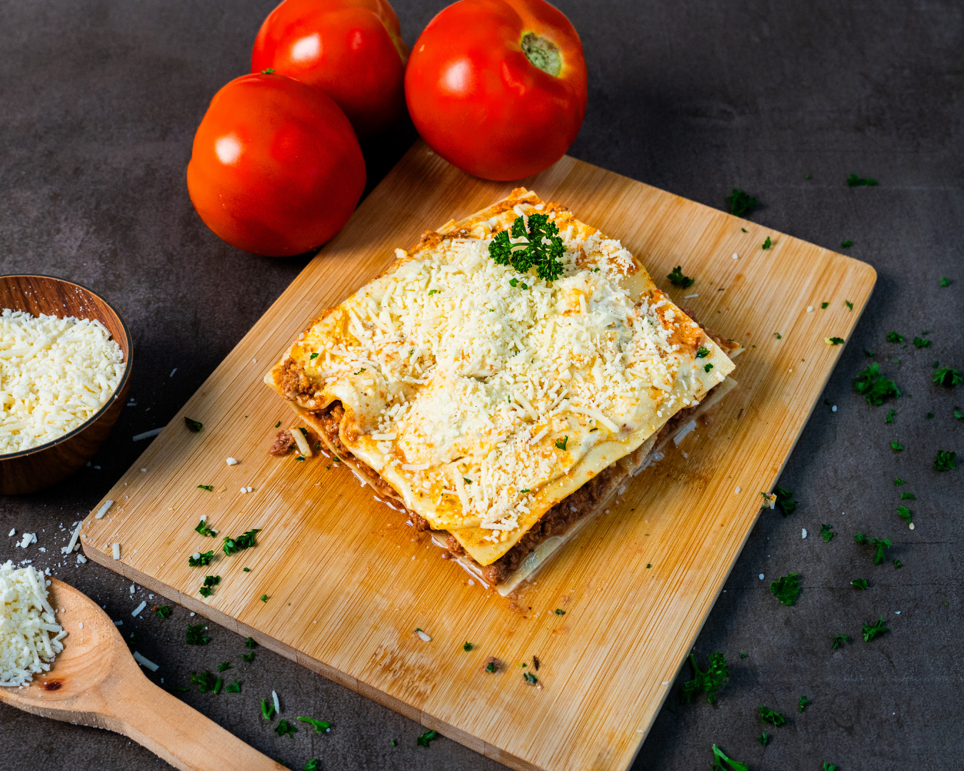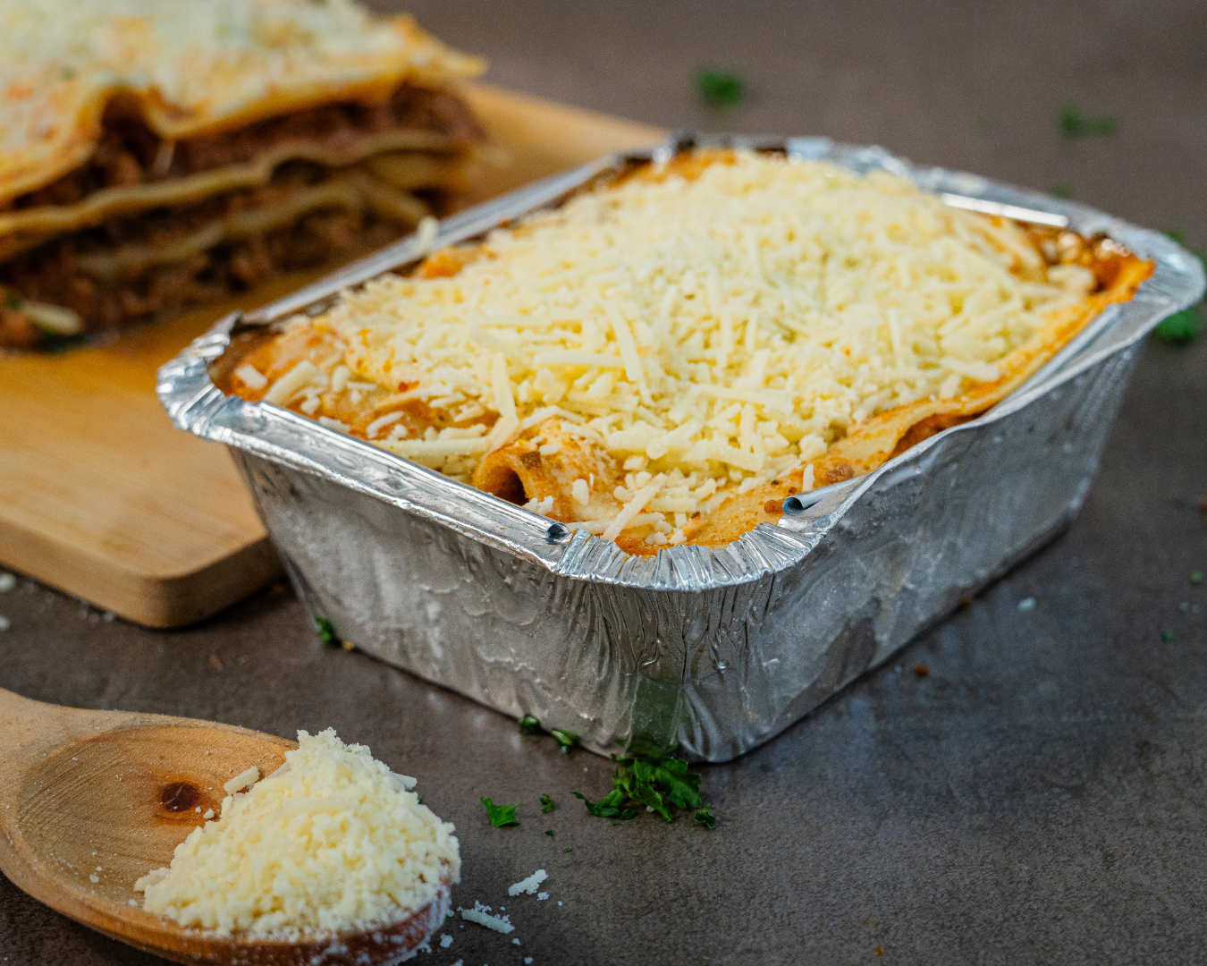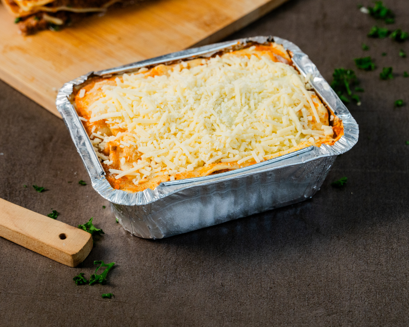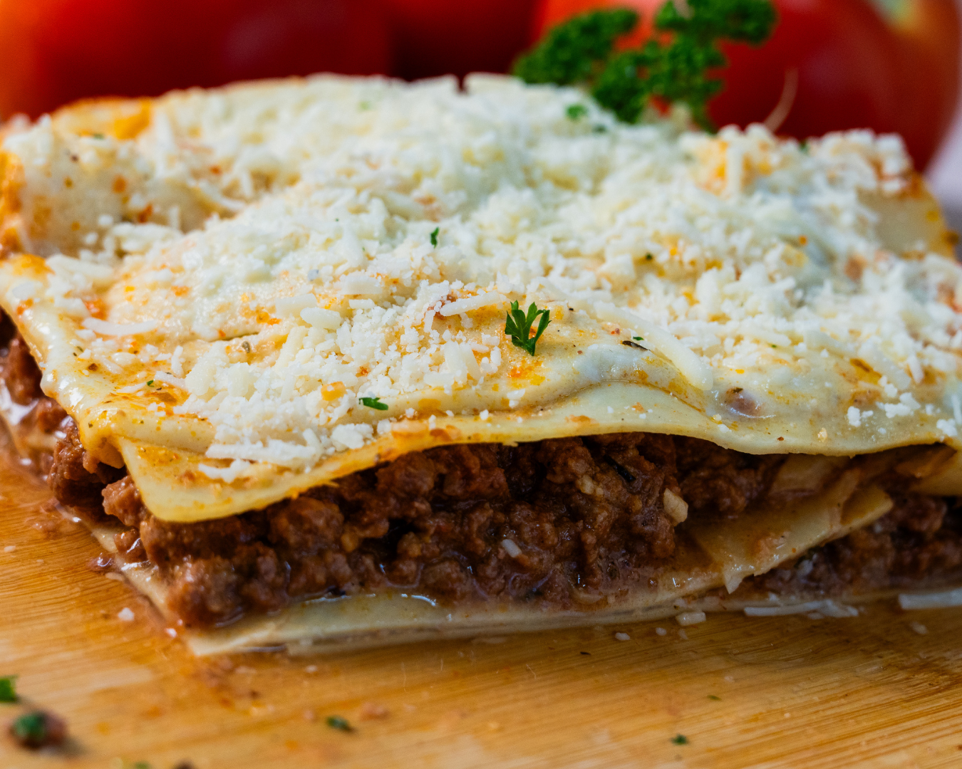 Una porción individual de la clásica lasagna italiana, hecha con capas de pasta fresca, salsa boloñesa casera y queso mozzarella gratinado.